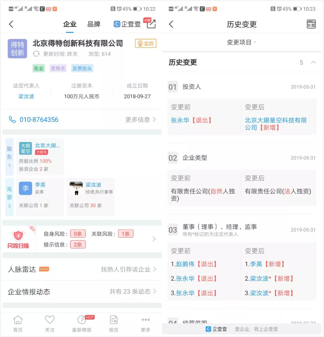 《新商业情报NBT》发现,5月31日,北京得特创新科技有限公司(以下简称得特创新)进行了新的工商资料变更,大股东由张永华变更为北京大眼星空科技有限公司,同时新增梁汝波为法定代表人、经理,监事由赵鹏伟变更为李英。