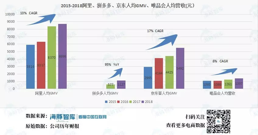 2015-2018年阿里巴巴人均GMV年均复合增长率为10%,2018年人均GMV高达8696元,远高于京东的5492元、拼多多1127元和唯品会2156元。但阿里用户的人均GMV贡献,在2018年已经相对乏力,也就3%左右。