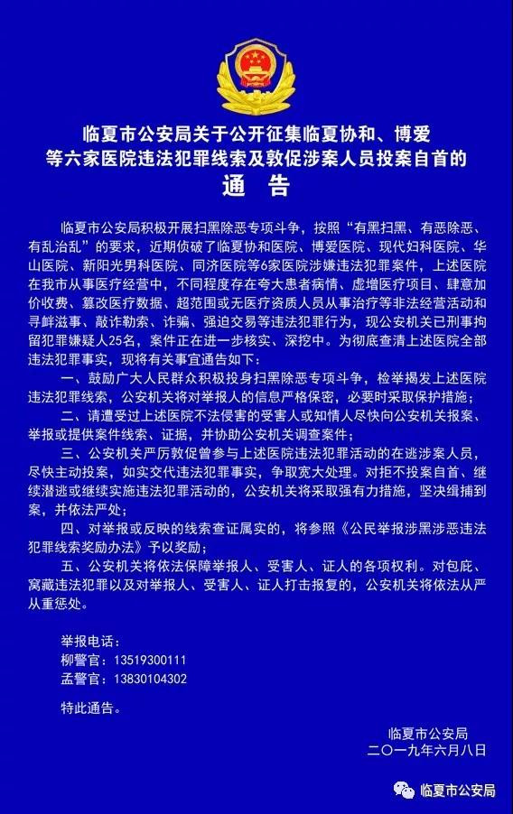 临夏市公安局发布的关于公开征集临夏协和、博爱等六家医院违法犯罪线索及敦促涉案人员投案自首的通告称,临夏市公安局积极开展扫黑除恶专项斗争,近期侦破了临夏协和医院、博爱医院、现代妇科医院、华山医院、新阳光男科医院、同济医院等6家医院涉嫌违法犯罪案件。
