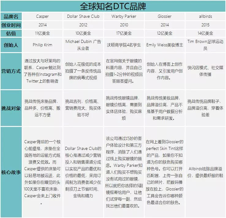 通过此表我们发现,全球最知名且最受资本青睐的DTC品牌都诞生于2010年之后,尤其是近五年。同时,这5个品牌所在的品类都是接近饱和的红海市场。而另一方面,这五个品牌中除了allbirds诞生于新西兰,其余基本都是生于美国长于美国。除了这些基本信息以外,这些品牌几乎都有一个相同点即挑战传统品牌的故事,如casper挑战传统床垫品牌的价高、物重、购买不方便;dollar shave club挑战传统剃须刀巨头吉利,让消费者为其高昂的广告费买单……