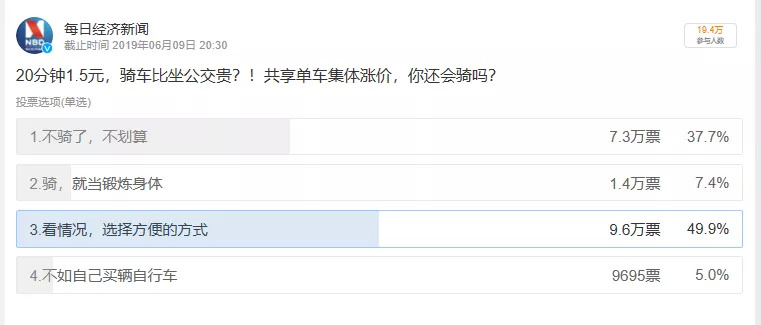 同时,在每日经济新闻发起“共享单车涨价超过公交时,是否还选择单车”的问卷投票中,有49.9%的用户选择视情况而定。
