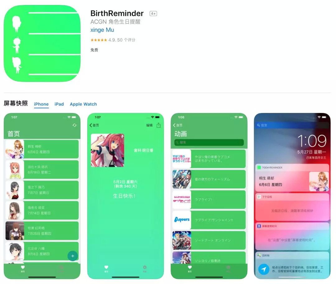 BirthReminder会在角色生日当天通过系统通知的方式来提醒用户,用于伟奇的话说:“妈妈再也不用担心我忘记老婆们的生日了 *:. . o(≧▽≦)o . .:*”。该App在App Store上获得了4.9的高分。