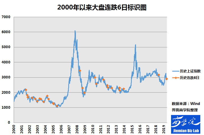 不过,仅靠2018年这一次不能说明历史趋势,6连跌后第7个交易日到底是涨还是跌,多空力量谁占上风,界面商学院试图从历史数据中一探究竟。我们根据Wind选取了从2000年至今的近20年上证指数数据作为基础。