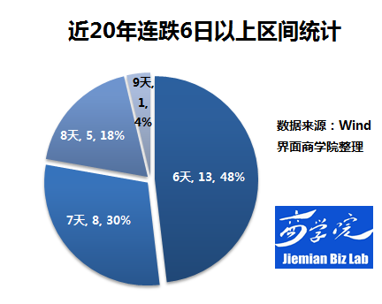 从上图不难看出,6天连跌后便止跌的交易区间有13个,概率为48%,略低于50%。同理,连跌7天后止跌的概率为30%,8天为18%,9天为4%,均值为6.78个交易日。我们可以认为,历史数据反映出第7日下跌与上涨的概率近似。更具体说,第7个交易日继续下跌的概率略大于止跌的概率,不过随着区间的延长,连跌的可能性便越小。换句话说,如果本周一大盘继续下滑,周二报复性反弹的可能性便较大。