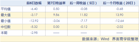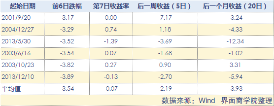 同时可以注意到,本期自5月30日开启的连续阴跌中,6个交易日大盘累计跌幅不到3%,也是2000年以来6连跌中整体跌幅最小的一次。如果针对累计跌幅不超过4%的历史交易区间进行统计的话,收益情况会相对不乐观(可以理解为市场没有跌透)。上表的统计中,6个满足条件的历史区间中第7日收益、后一周收益以及后一个月的收益平均水平分别为-0.07%、-2.19%以及-3.93%,均要低于前表的平均收益水平。