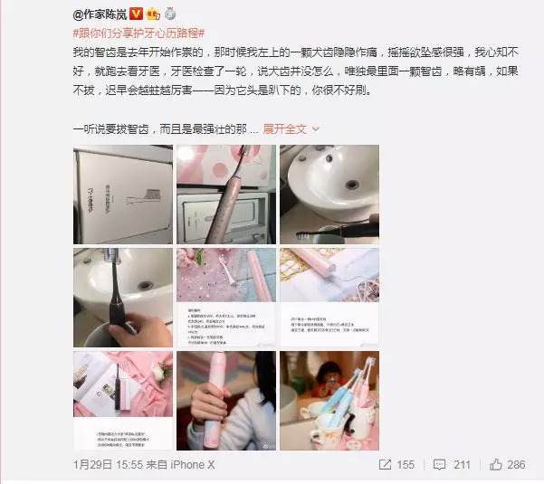 借“余光中”为电动牙刷打广告的,马家辉算得上中华第一人了。在公知时代崛起,被内地网友熟知的五岳散人,则是另一个路数——洋洋洒洒的千字软文发完后半个月,五岳散人发文称此前四环素牙的故事是在厂商要求下“杜撰”的,同时顺道又为该品牌做了波推广,“反正做广告嘛,东西我也用了,没问题就行,给谁做不是做啊”。女作家陈岚为给电动牙刷的出现做铺垫,用近两千字的篇幅讲述了一颗智齿的故事,其中描写牙医的一段话足见其“用力程度”:“一双范·迪塞尔的眼睛,温和亲切地看着我。”