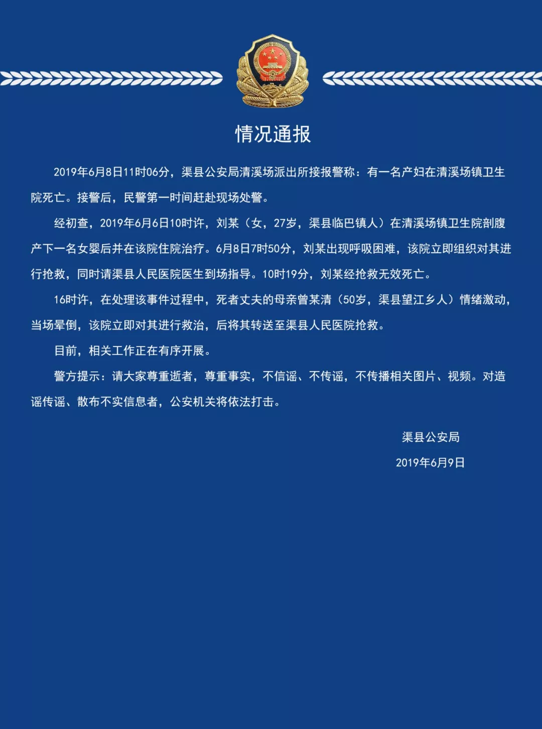四川渠县公安局9日发布警情通报,2019年6月8日11时06分,渠县公安局清溪场派出所接报警称:有一名产妇在清溪场镇卫生院死亡。接警后,民警第一时间赶赴现场处置。