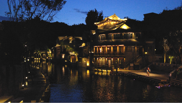 等天色进一步变暗时,通过调节色温、ISO、快门速度等一系列参数,古镇的夜景得到比较完美的呈现,并且保持了天空的深蓝色,与黄色灯光形成鲜明对比。