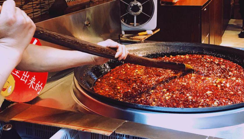 卖火锅底料的商户会在门口架起一口大锅,火锅的香味飘散在街巷中,是磁器口独特的气味。