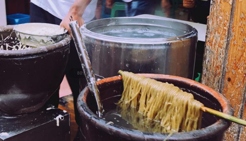 手工现制酸辣粉的小贩一边制作一边大声招徕过路的游客,酸爽麻辣的重庆味道是你经过这里绝不能错过的。