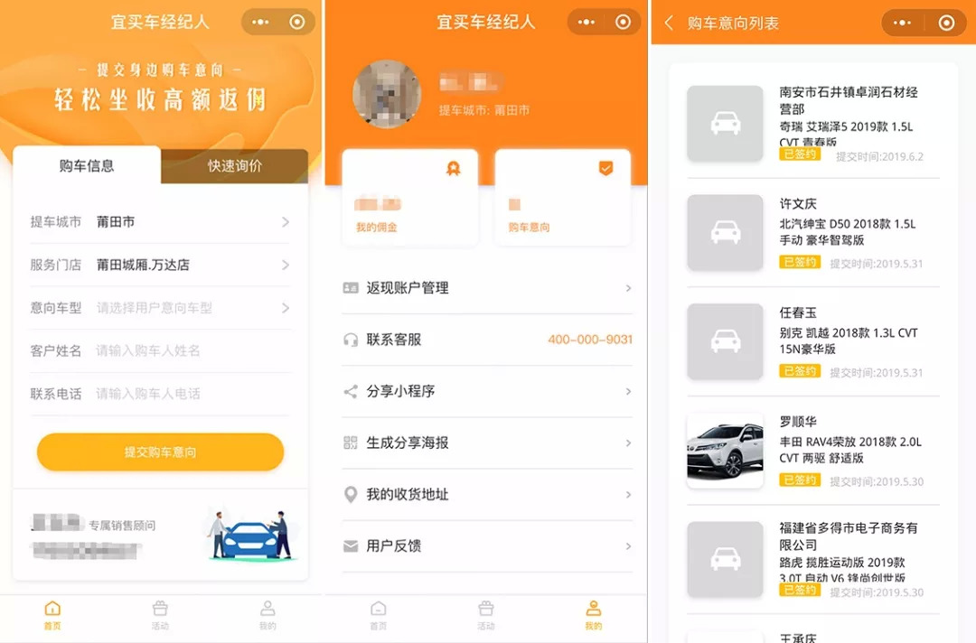 在宜买车经纪人端小程序上,经纪人用户可以查询车价,提交客户信息,查看自己的佣金情况以及客户的购车进展。