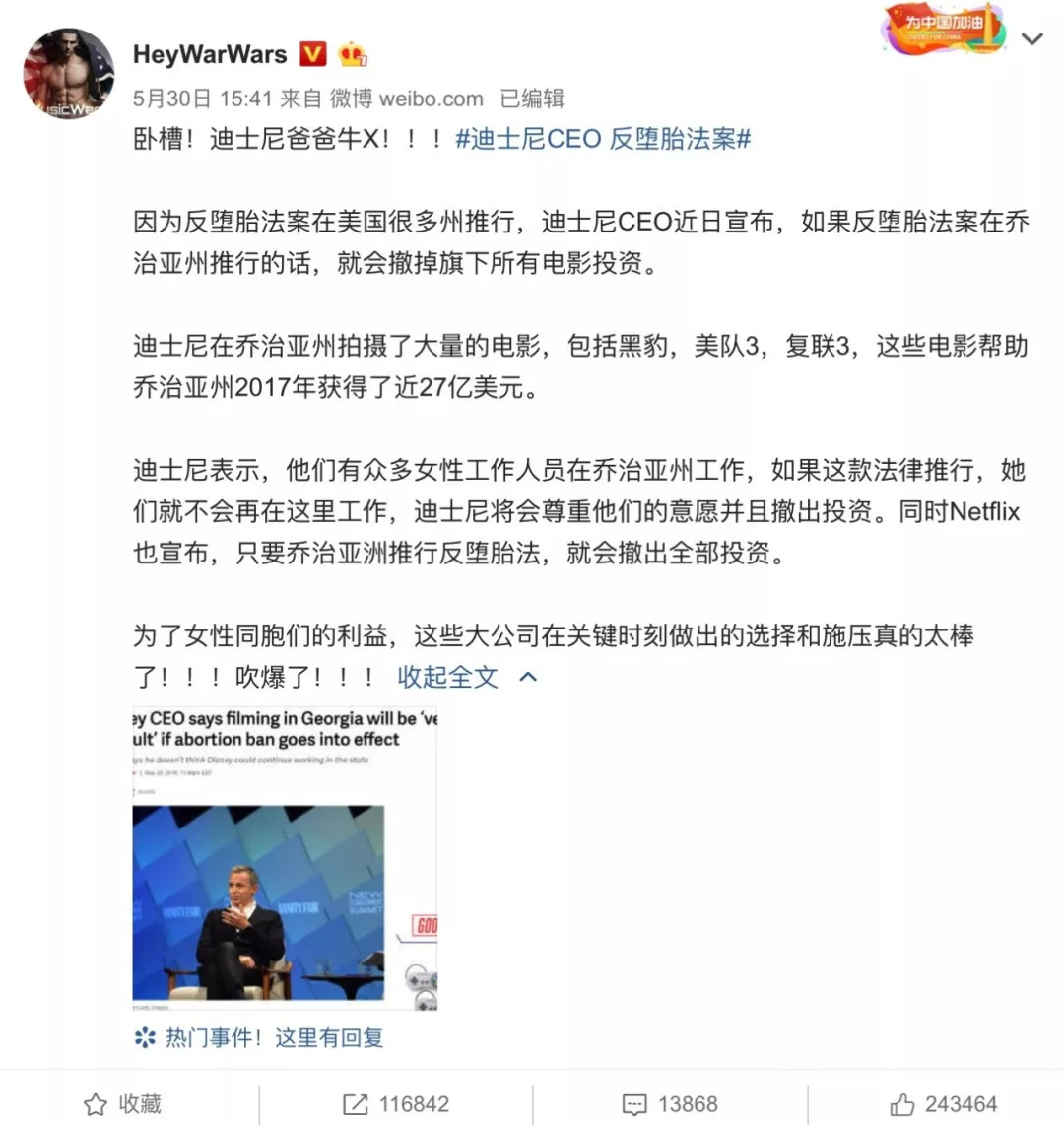 迪士尼的努力颇有成效。上周,#迪士尼CEO 反堕胎法案#登上微博热搜,其中一条微博的互动数超过三十万,“迪士尼保护世界上的每一位公主”的评论引发了用户的广泛共鸣。