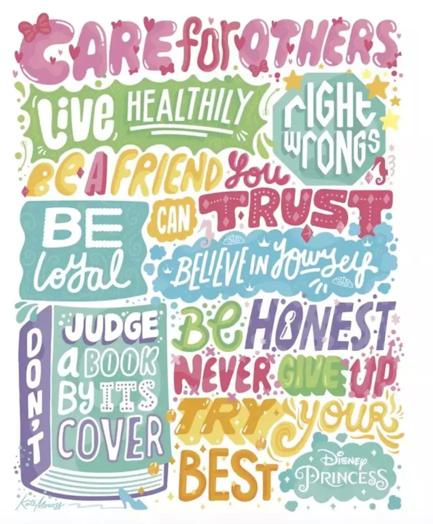 实现自我价值成为了新时代公主故事的主题,并成为公主们人生中的头等大事。更重要的是它是一个泛性别的议题,无论你如何定义自己的性别,都会面临相同的困惑。2016年,迪士尼第一次发布的“公主准则”更接近于普世价值,完全抹去了性别的痕迹: