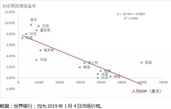 中国经济长期以来回报水平高于发达国家,拿十年期国债收益率对比如下。