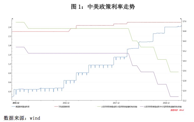本文将2015年底美联储开启加息周期以来的中美货币政策大致分为同步(2016年8月-2018年3月)和分化(2018年4月-2018年12月)两个阶段。同步阶段始自2016年8月,中国央行重启14天逆回购,“收短放长”结构性提高资金利率,并逐步上调逆回购操作中标利率(OMO)和中期借贷便利(MLF)操作利率,货币政策跟随美联储加息收紧。分化阶段始自2018年4月,中国央行不仅未跟随美联储加息,甚至开始降准,并采取MLF、TMLF等货币政策工具,向市场投放流动性。