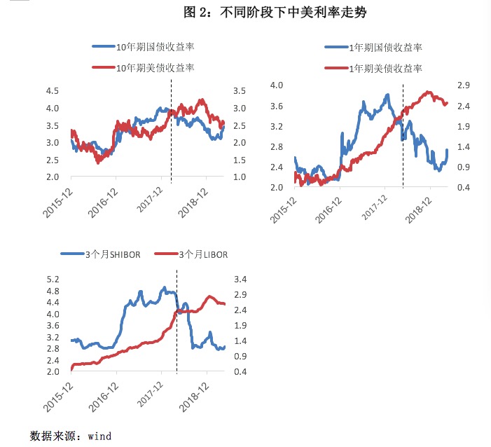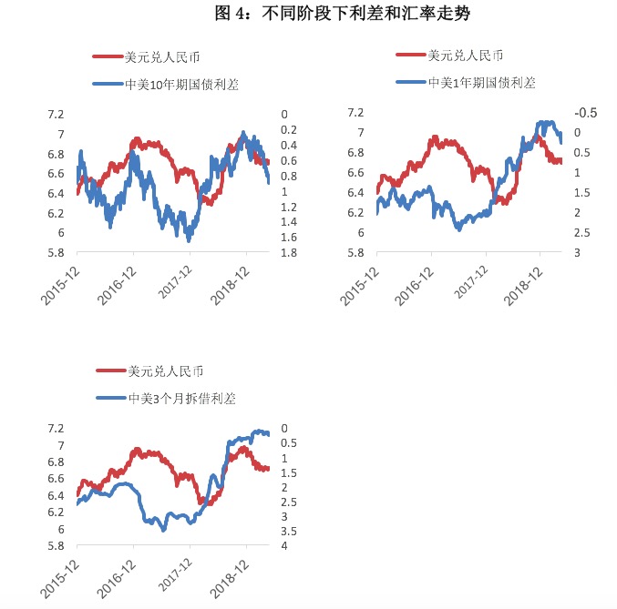通过观察两个阶段下中美不同期限(10Y、1Y、3M)利率的走势,不难发现,长端利率(中美10年国债)走势基本一致,即不论中美货币政策同步或是分化,长端利率基本同涨同跌。但是,中短端利率的规律则完全不同,在中美货币政策同步趋紧时,中美的中短端利率同步上行,而在中国货币松、美国货币紧时,中国的中短端利率逐步下行,美国的中短端利率逐步上行。