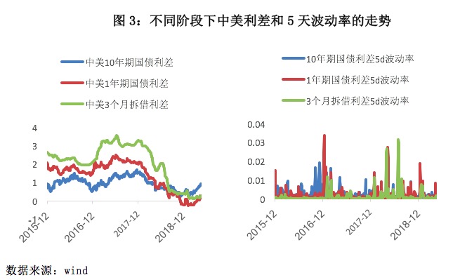 接下来,我们探究两个阶段下中美不同期限(10Y、1Y、3M)利差的特征,由图3可见:在中美货币政策同紧的情况下,各期限的中美利差基本保持相对稳定,但在中美货币政策分化的情况下,各期限的中美利差迅速下跌,逐渐接近0附近。
