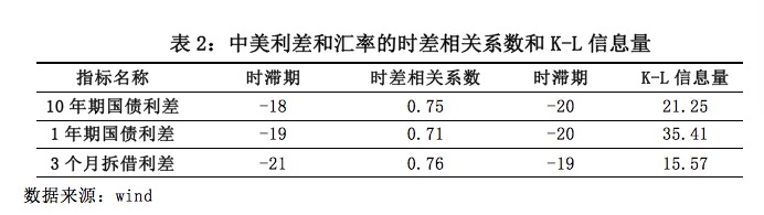 分别计算中美利差(10年、1年、3月)和汇率的时差相关系数和K-L信息量,如下表所示: