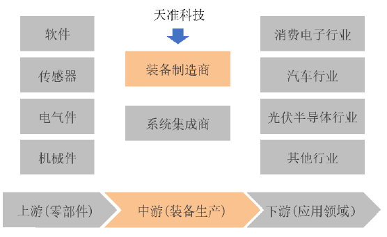 天准科技处于行业中游的装备生产阶段,属于装备制造商,首先相较同处中游的系统集成商而言,天准科技具备机器视觉算法、传感器、精密驱控等核心技术,拥有集成能力。