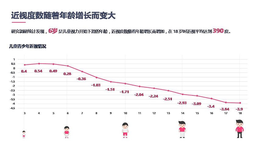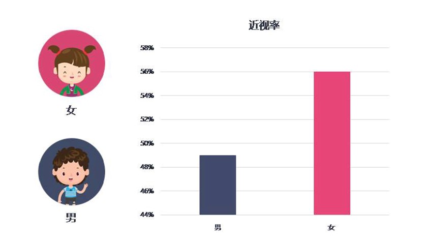 6月6日,针对当前中国的近视和视网膜病变两大眼健康问题,《青少年视力发展影响因素白皮书》发布。《白皮书》显示,当前中国儿童青少年近视问题越发严重,经过对 61423 名学生的调研发现,当前儿童青少年近视率高达53%,男、女生近视率分别为49%和56%;儿童视力从6岁开始出现下滑,近视度数会随着年龄增长而增加。《白皮书》从孩子每天的户外活动时间、近距离用眼时间、平时生活和学习过程、不良的眼睛行为习惯及父母近视度数、台灯照明等多角度,对孩子近视的影响程度进行了分析。