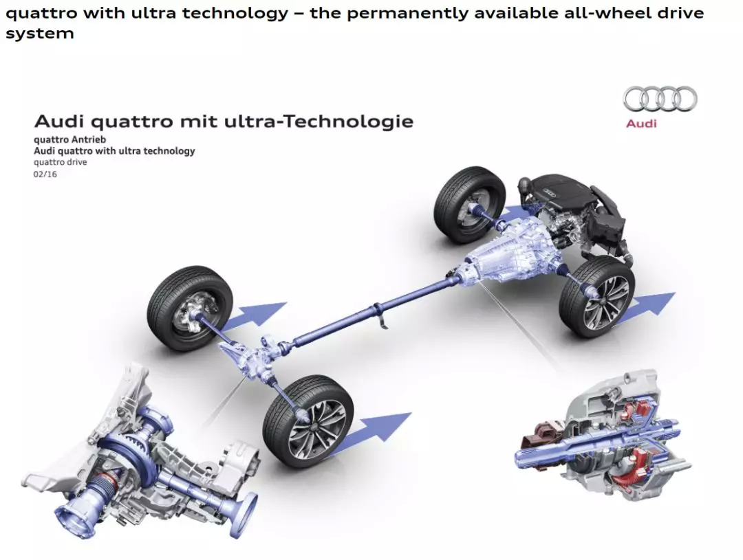 ▲这套四驱系统,在奥迪的官方宣传里面已经变成了,“the permanently available all-wheel drive system” ,“可永久全时的四驱系统”,跟我之前那篇“permanent all-wheel drive”描述差异还是很大的。