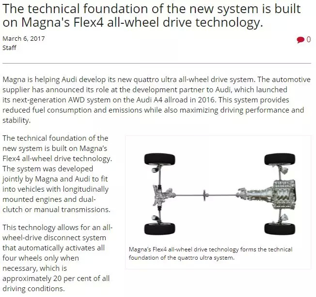 除这个最大的争议以外,奥迪官方其实已经做过必要的解释,并未强行称为“永久全时”。这套第8代四驱系统,是奥迪和麦格纳一起开发,并基于麦格纳的Flex4 驱动技术。