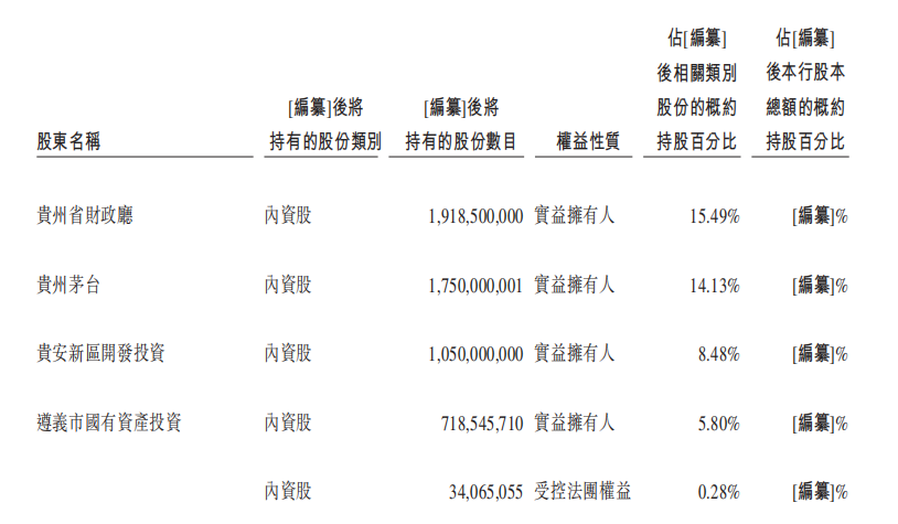 除贵州茅台外,贵州银行持股5%以上股东还包括:贵州省财政厅、贵安新区开发投资和遵义市国有资产投资,分别持股15.49%、8.48%和5.8%。