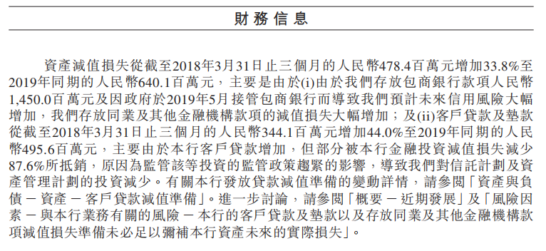 招股书显示,截至2019年3月31日,该行存于包商银行的同业存款为人民币14.5亿元。贵州银行表示,鉴于包商银行的存款预期信用风险显著增加,经过评估和与监管部门的讨论,贵州银行将2019年前三个月存放于包商银行的款项确认减值损失人民币1.74亿元。