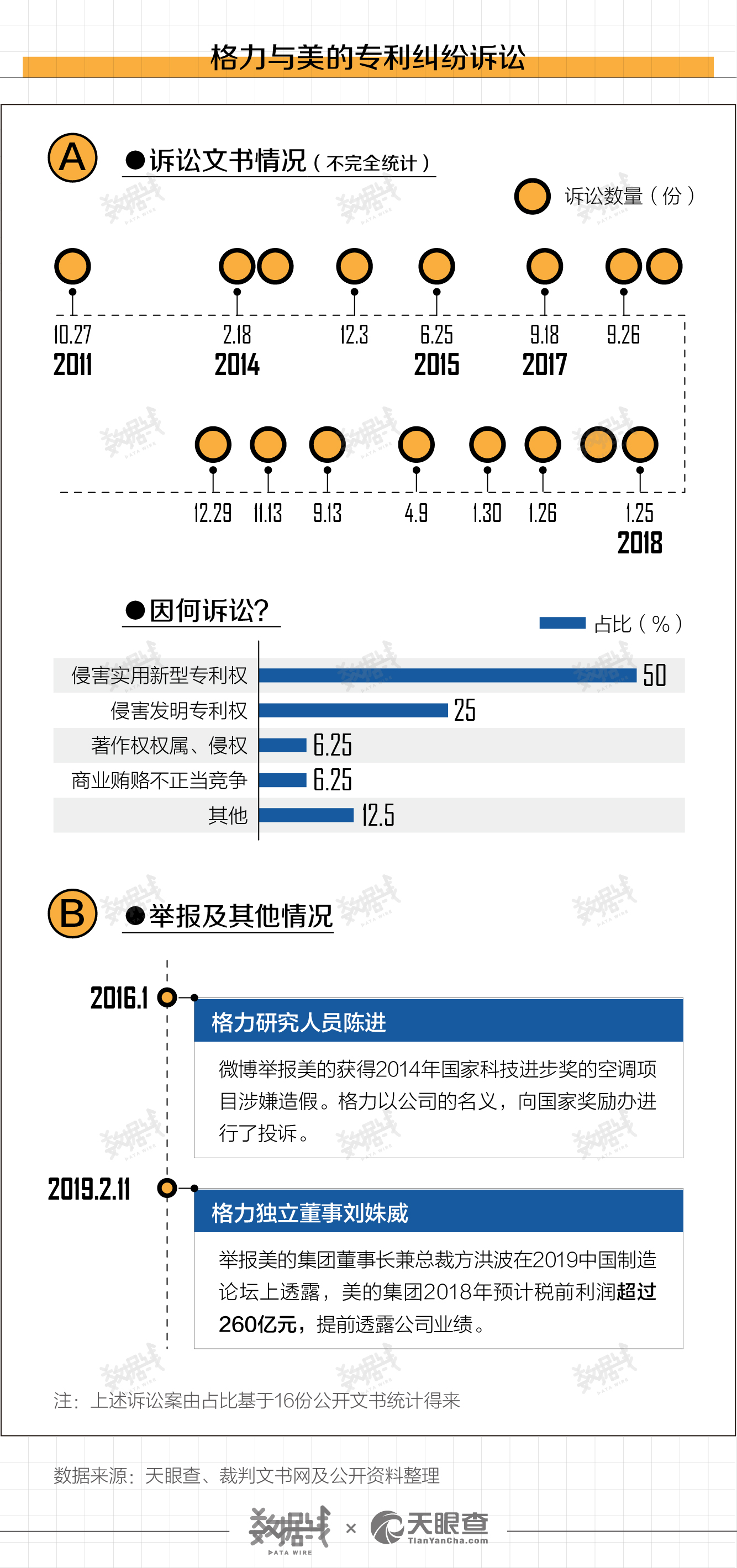 不仅“交战”奥克斯,格力和美的也多次缠斗。界面数据(公众号ID:shujuxian_kuaikan)以“格力”、“美的”和“专利”为关键词在中国裁判文书网上进行检索,共计获得54条匹配结果,在对其中16份文书信息(涉事双方明确为美的和格力)进行统计后发现,格力与美的之间的专利诉讼可追溯至2011年,2018年双方的诉讼文书数量最多。