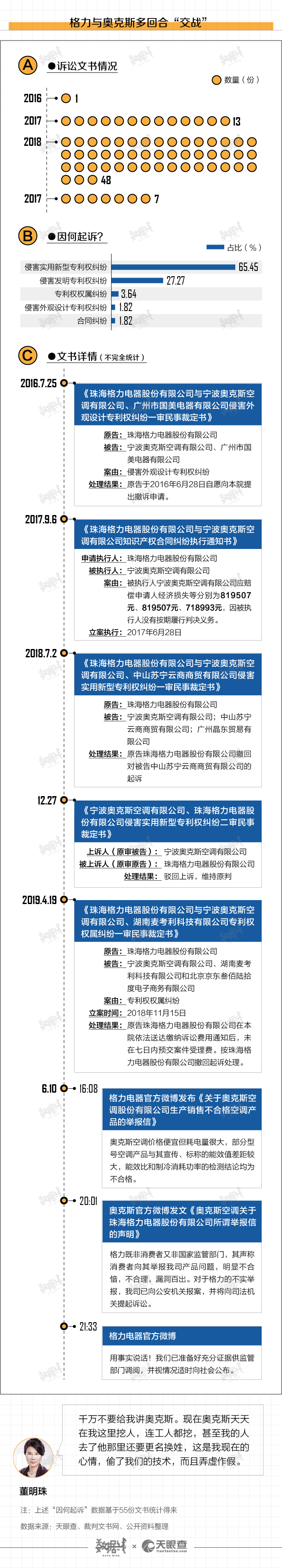 天眼查数据显示,2016年至2019年,格力同奥克斯之间的诉讼文书共计69份。仅2018年1年,诉讼文书量达48份。