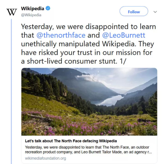 为了在谷歌图像搜索结果中占据最热门的位置,户外服装公司 The North Face(北面)在维基百科的文章中偷偷植入了广告照片。如果不是它们大张旗鼓地自我宣传,事件可能一直不会被曝光。