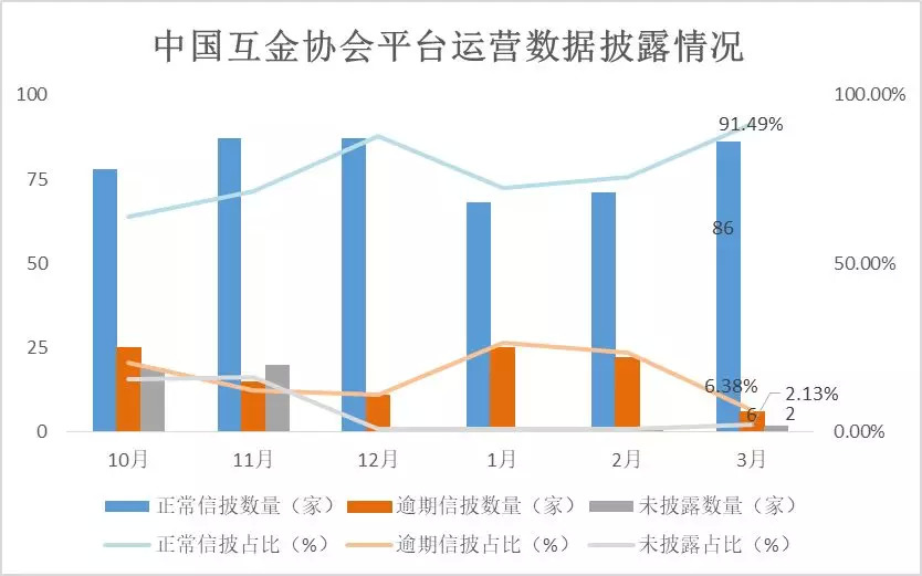 94家协会会员平台中的86家及时披露了3月的运营数据,占全部信披接入平台的91.49%,高于1月和2月的72.34%和75.53%;延迟披露的平台降至6家,占全部平台的6.83%,低于1月和2月的26.6%和23.4%;未能如期披露的有2家,较1月和2月增加1家。