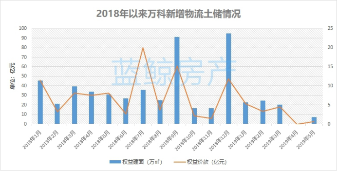 财报显示,2018年,万科新获取物流地产项目64个,耗资95.5亿元,合计可租赁物业的建筑面积约为494万平方米。2019年,万科明显放缓了物流项目的扩张步伐。今年1-5月份,万科共获取9个物流地产项目,权益金额仅13.78亿,相比去年同期减少了64%。