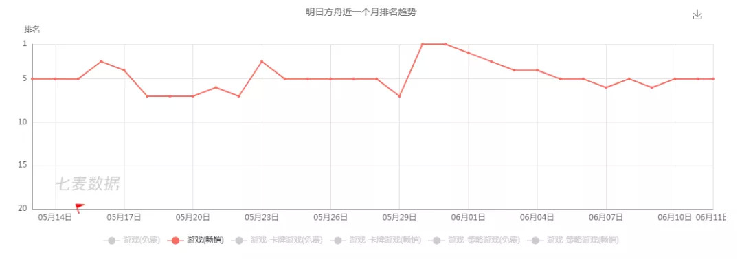 5月最大的亮点莫过于鹰角网络的二次元手游新品《明日方舟》,该作4月30日正式公测并于上线的几天后来到畅销榜前10,经过一个多月的时间,《明日方舟》已经基本稳定在畅销榜的前5位置。