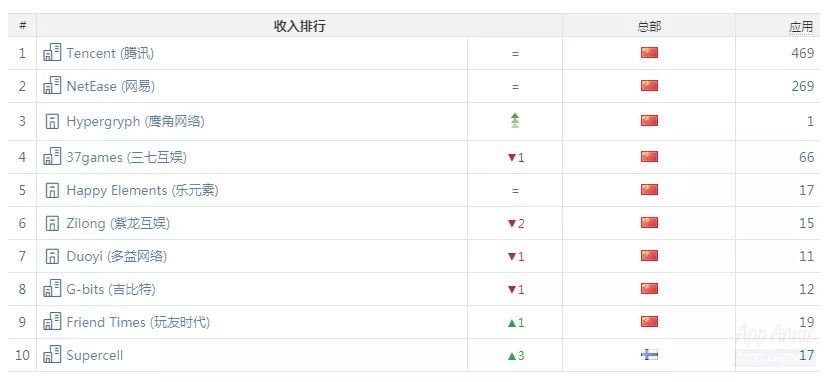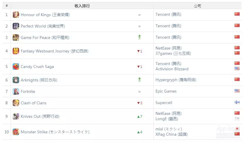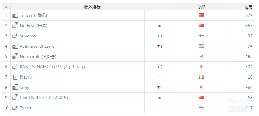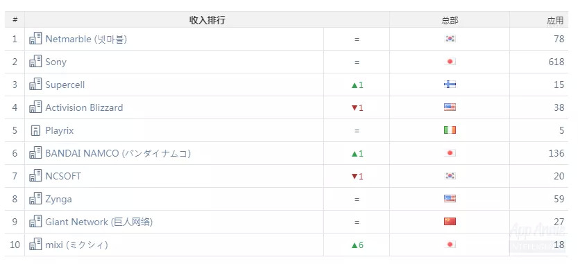 公司收入榜前10维持不变,Supercell和动视暴雪互换位置,两家日本厂商万代南梦宫和索尼也发生异位。