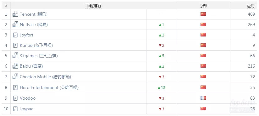 美国社交游戏巨头Zynga排名第8,唯一一家中国公司巨人网络紧随其后。