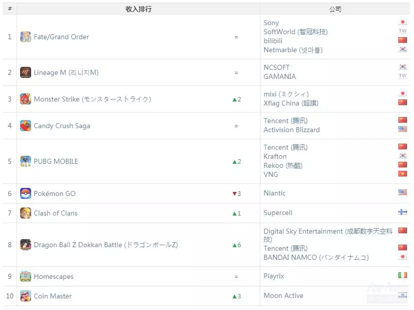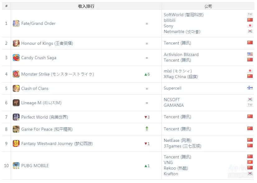 全球总收入前3已经有三个月没有发生任何变动,只是《王者荣耀》和《糖果传奇》的排名偶有交换,《F/GO》则蝉联榜首半年。