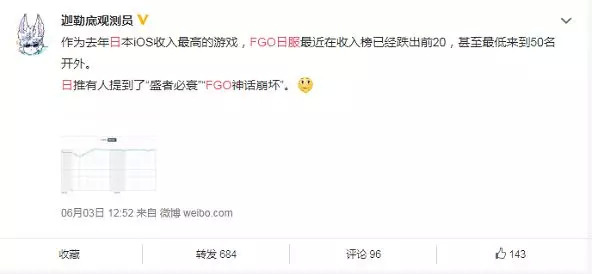 对此,日本推特上亦有人认为这是《F/GO》盛极必衰的体现——早在去年年底,《Fate》系列的原作者奈须蘑菇就曾在访谈时公开表示由其亲自担任剧情主笔的《F/GO》将在第二章故事结束后一同完结,他的言论也为这款当前全球最吸金手游的长线运营战略蒙上了一层阴影。