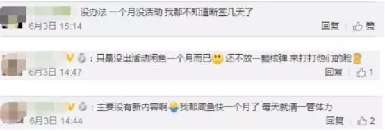 众所周知,《F/GO》频繁且稳定的新内容是其保持长线运营的根基,但《F/GO》近一个月的断更却使打破了这条长久以来的更新规律,这也是造成《F/GO》营收断崖式下滑的根本原因。将近一个月的时间没有活动可做,没有新的卡池,没有新的角色,缺乏新内容成为《F/GO》日服如今面临的最大问题,从玩家的评论中也可以看到,许多没有新内容刺激的玩家已经开始“咸鱼”了。