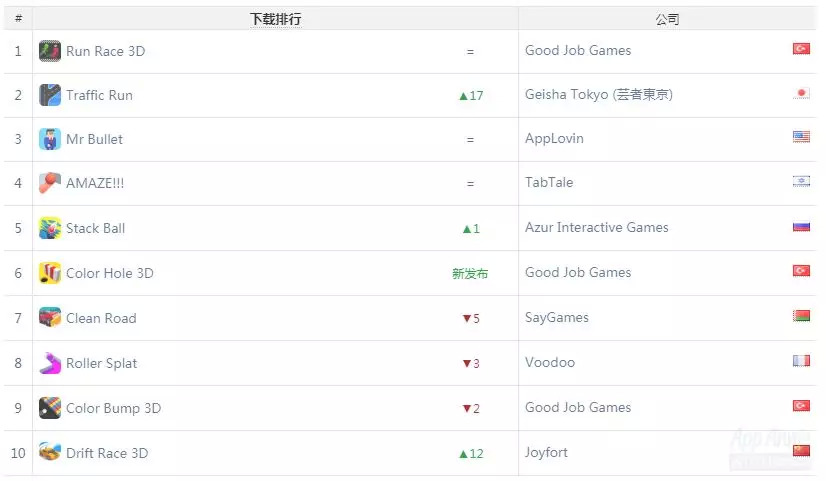 相比多款新作登榜的4月,5月下载榜的变化不大。日本发行商Geisha Tokyo (芸者東京)凭借休闲汽车驾驶手游《Traffic Run》一举站上第4,4月凭借《Clean Road》《Twist Hit》走进业界视野的白俄罗斯游戏公司SayGames,又把一款新作《House Paint》捧进了前10——其打造爆款的能力可见一斑。