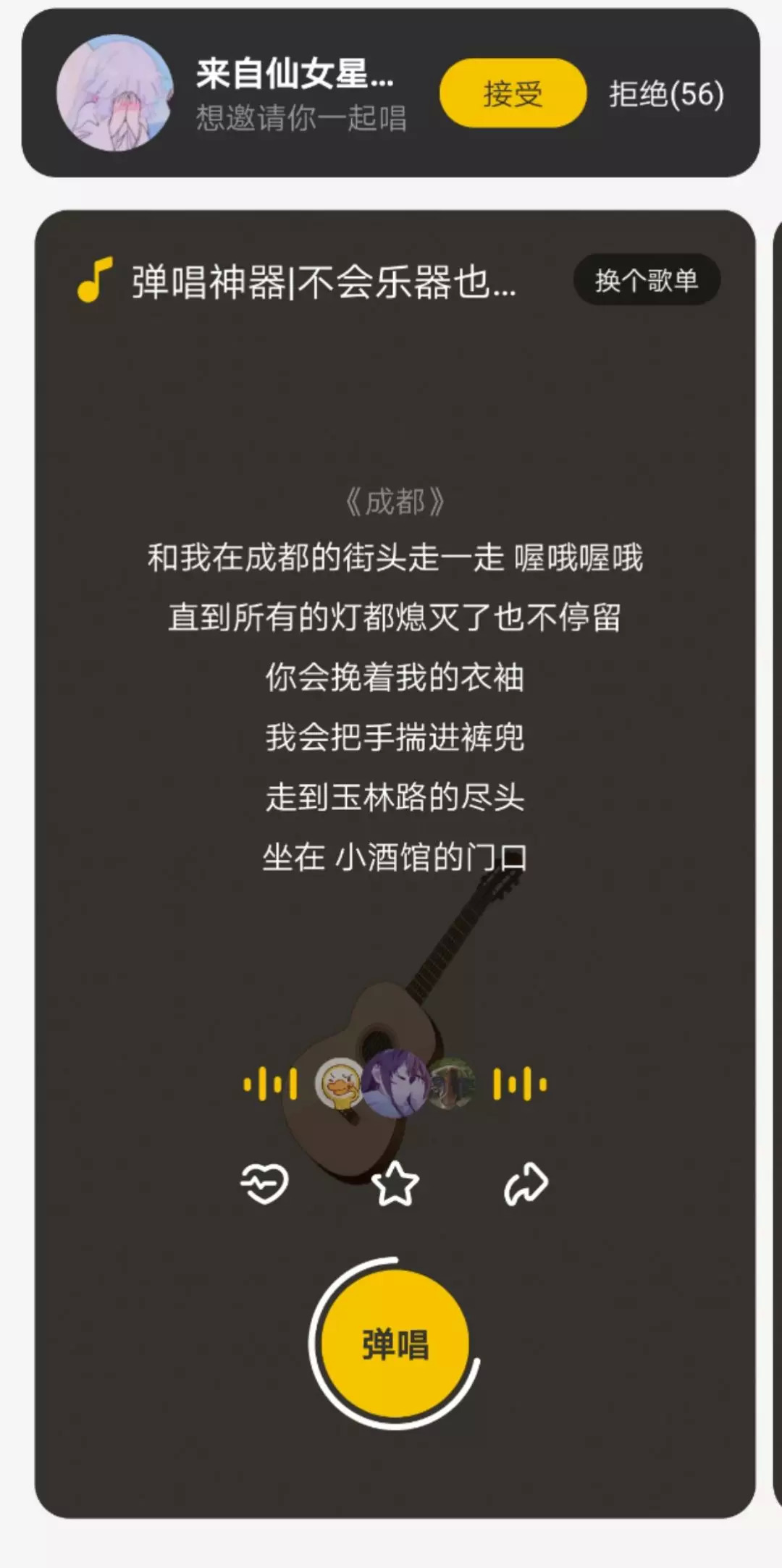 对于那些嗓音优秀的弹唱者,用户可以直接在这里点击心动按钮(类似“点赞”)、收藏到“我喜欢的歌”中,或者直接分享到微信、QQ、朋友圈等处。一段歌曲结束后系统会自动切换同一歌单的下一段歌曲。点击歌曲页面中的用户头像区域,下方会弹出“唱过的人”列表,用户可以听到所有已发布的演唱片段,并能够关注、点赞和评论弹唱者。