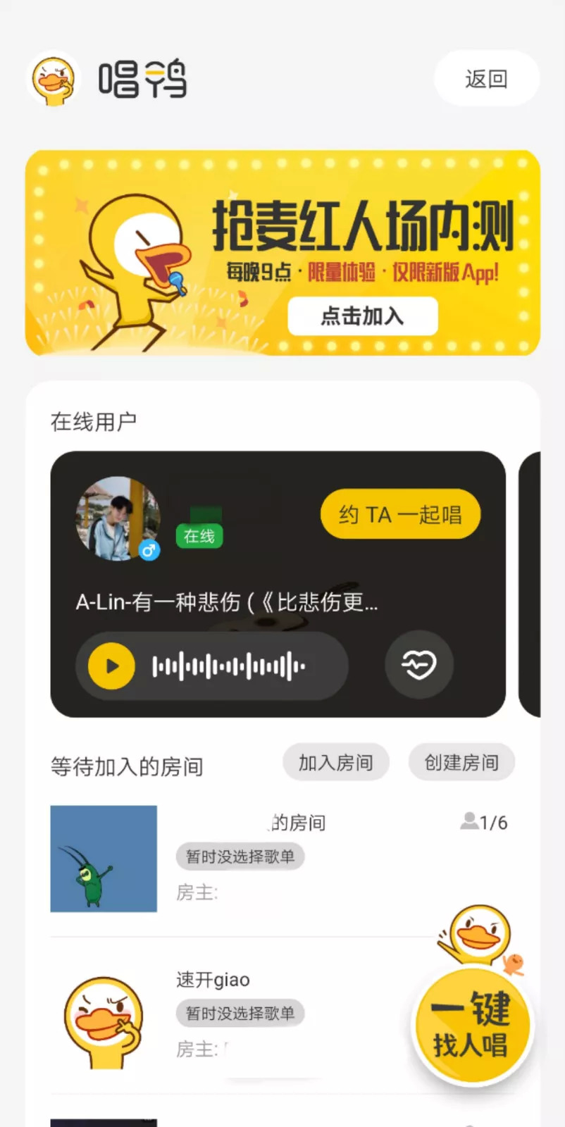 作为一款音乐社区类产品,点击唱鸭App主界面右上角的“999+人等你来唱”将进入到房间抢歌页面,与音遇的玩法类似,用户可以自己创建房间、输入房间号加入房间或在列表中挑选房间加入,参与6人K歌,拼手速抢唱。同时,通过一键找人唱或者接受其他用户的随机邀请,也能自动匹配6人K歌房。