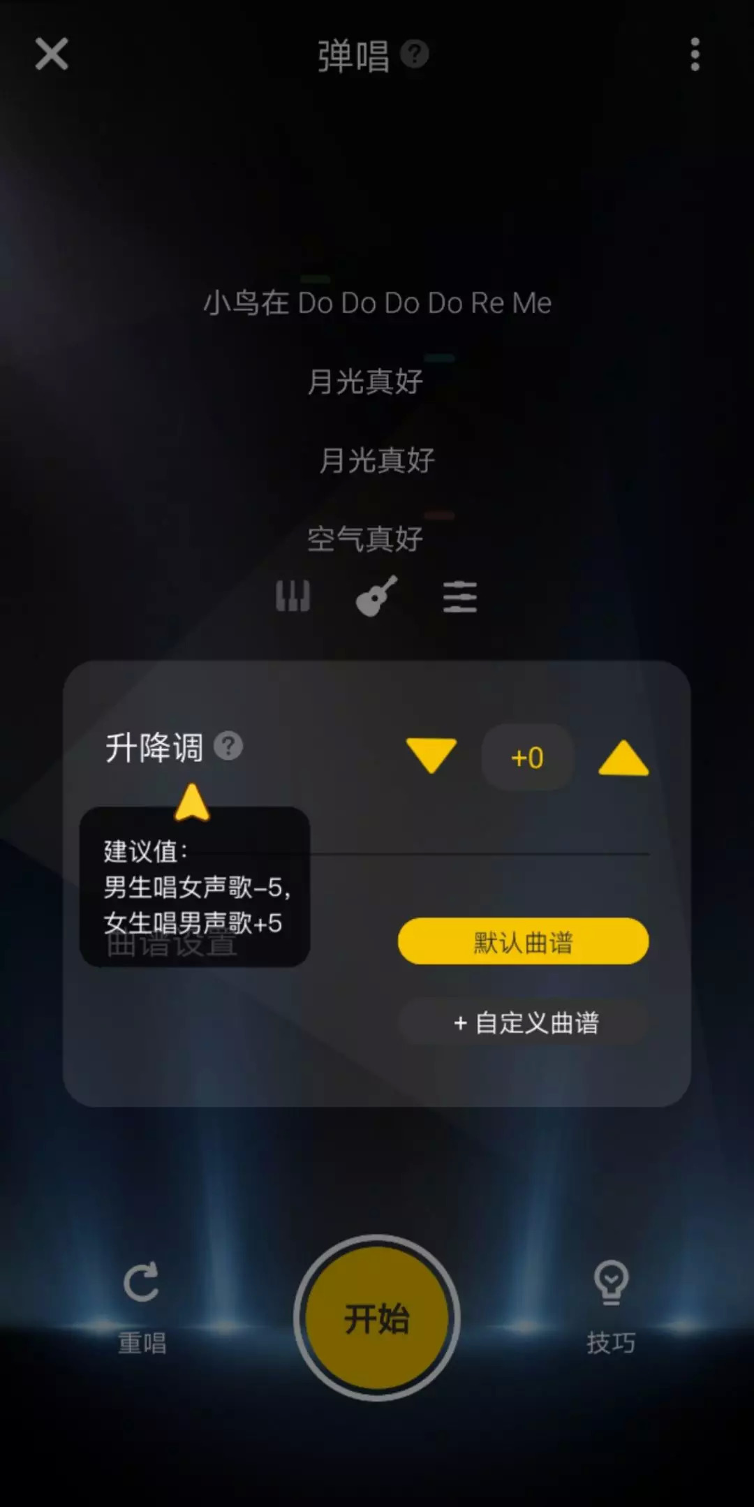 目前,弹唱部分提供清唱模式和吉他、钢琴两种乐器的弹唱模式。以吉他为例,系统提供一套默认曲谱和对应和弦,每个音符对应的按键都会在歌曲上提示,为用户提供一种“包教包会”的教学模式。对于有基础能力的用户,系统提供自定义曲谱及和弦的功能。同时系统还提供了重唱和视频技巧教学,进一步降低用户学习和创作门槛。