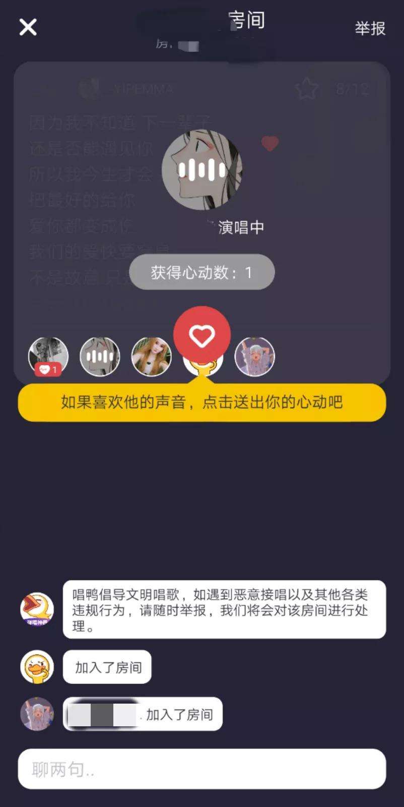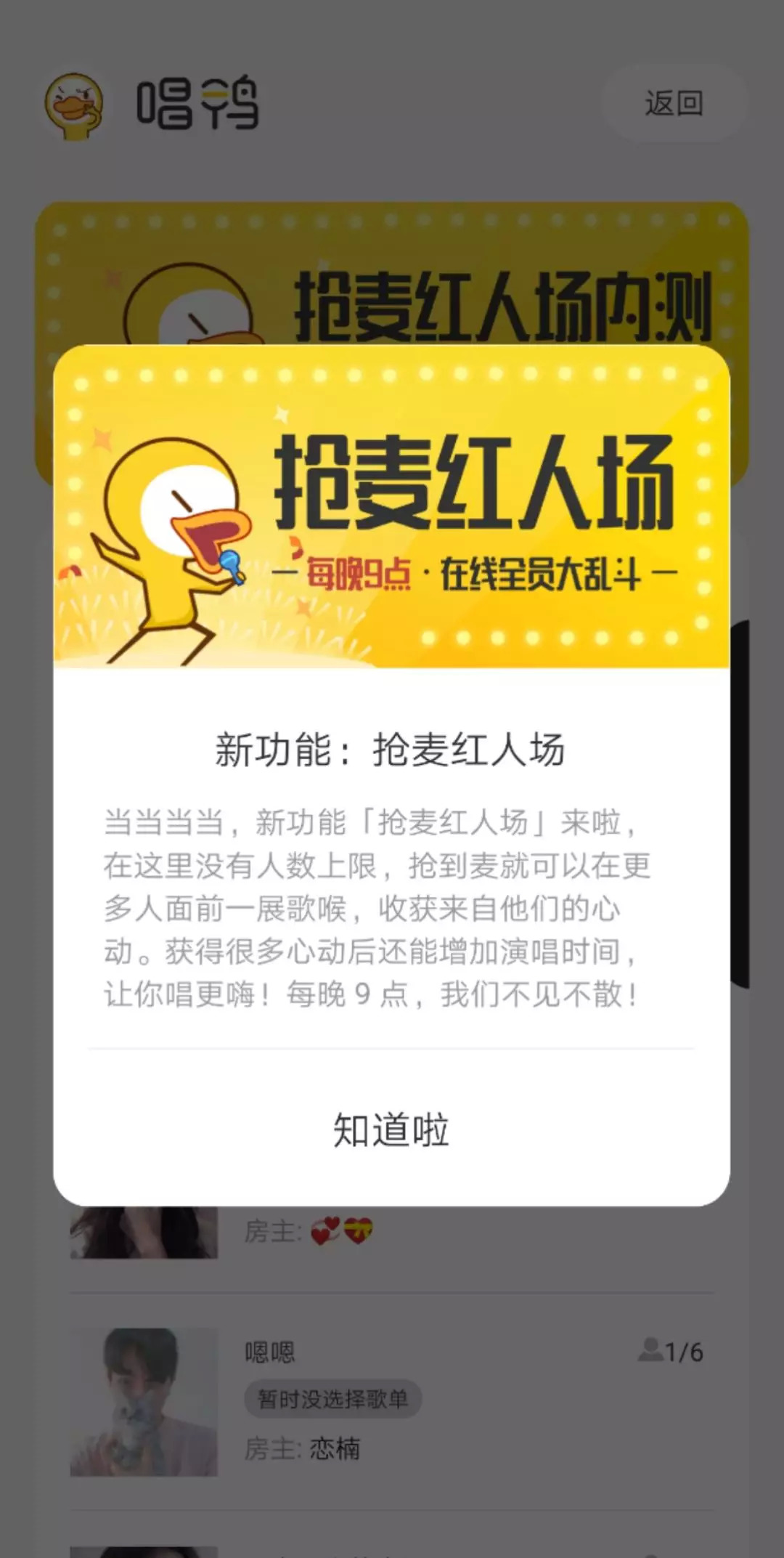同时,唱鸭App还在内测房间人数更多的抢麦红人场,每晚九点限量体验,在房间中每获得五个心动,就可以将演唱时间延长10秒钟。这些功能设置已经显现出初级的社交属性,在抢唱之余,会出现在房间中进行语音或文字聊天的情况,比如聊高考考了多少分。