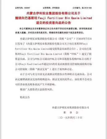 始于去年7月的伊利股份(600887.SH)收购巴基斯坦乳企Fauji FoodLimited一案,因“与卖方无法就拟议的股份出售和转让达成协议”,在近期以失败告终。