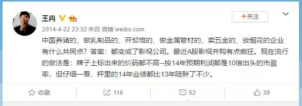 2014年的4月,易凯资本有限公司CEO王冉在微博上调侃上市公司转型影视文化业务。当时恰逢国内电影总票房连续多年上涨,而资本市场上影视概念更是被热炒,不少上市公司纷纷通过并购转型成为影视传媒公司。