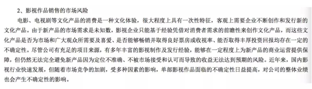造成电影投资成本居高不下、收益逐渐收窄的原因有很多,既有明星片酬暴增、宣发费用迅速增长等因素,也有档期竞争加剧导致票房收益下滑、影片制作水准提高等行业发展中必然会出现的问题。尽管目前国家已经出台政策限制明星高片酬,但很多公司对于成本出现实质性下降仍不抱有乐观态度,并将“成本持续上涨”列入了公司风险当中。
