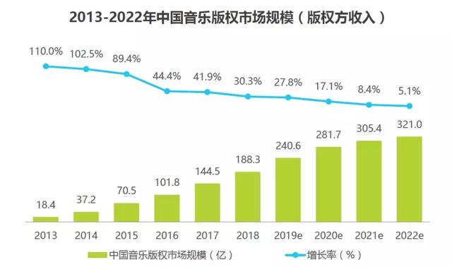根据艾瑞咨询数据,在中国音乐版权市场规模从2013年的18.4亿元人民币,增长到2018年的188.3亿元。对于数字音乐行业来说,这是一块巨大的蛋糕。