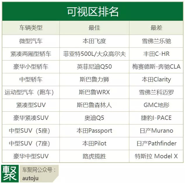 个别车有明显的优势,有一个戏剧性的异常值。例如,在紧凑型SUV中,斯巴鲁森林人远远优于其竞争对手,拥有良好的可视区这一特点对刚拿驾照的青少年和高龄驾驶员特别有吸引力。