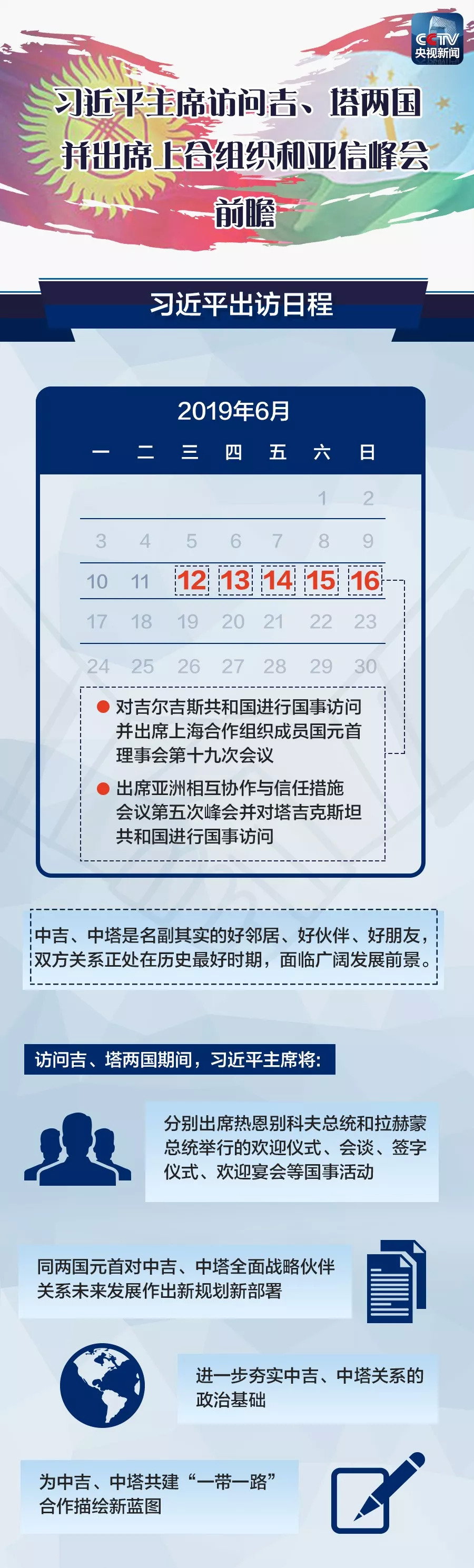 习近平主席将于6月12日至16日对吉尔吉斯斯坦、塔吉克斯坦进行国事访问并出席在比什凯克举行的上海合作组织成员国元首理事会第十九次会议和在杜尚别举行的亚洲相互协作与信任措施会议第五次峰会。